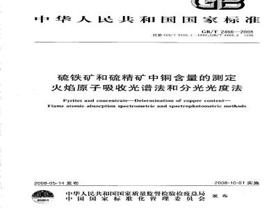 中文名称:硫铁矿和硫精矿中铜含量的测定 火焰原子吸收光谱法和分光光度法