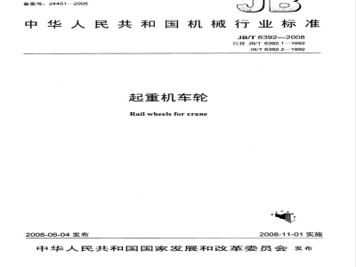 本标准代替JB/T6392.11992《起重机车轮型式尺寸、踏面形状与轨道的匹配》和JB/T6392.2-1992《起重机车轮技术条件》。本标准与JB/T6392.1—1992和JB/T6392.2—1992相比,主要变化如下:合并了JB/T6392.1一1992和JB/T6392.21992的内容,并对标准中章条的编排做了调整;对规范性引用文件的内容进行了修改-对JB/T6392.1一1992中的表1~表3作了调整并合并为本标准的表1,删除了原表1中的参考尺寸;