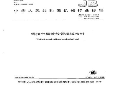 本标推与JB/T6373—1992科JB/T8723—1998相比,主要变化如I下:将两项标推合并修订,名称改为《焊接金属波纹管机械密封》:-对原JB/T6373—1992和IJB/T8723—1998标准的适用范用进行了修改:对原JB/T6373一1992标准中的术语与定义进行了修改;对原JB/T6373—1992和JB/T8723—1998标准中的妥求进行了修改:-对原JB/T8723一1998标推中的基本型式、材料代号及布置方式进行了修改:对原JB/T6373—1992和JB/T8723—1998标推中的检验规则与方法进行了修改:对原JB/T6373-1992和JBT8723—1998标准中的安装与便要求进行了修改。本标准由中国机械工业联合会提出。本标准由机械工业机械密封标准化技术委员会归口。本标准由丹东克隆集团有限责任公司、西安永华集团有限公司、四川日机密封件有限公司、上海博格曼有限公司、合肥通用机械研究院负责起草。本标准主要起草人:俞龙海、郭华中、王慧、王庆、胡力航、张智、吴兆比、班玉红。本标准所代替标雅的历次版本发布情况:-JB/T 6373—1992: