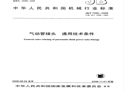 本标准代替JB/T7056一1993《气动管接头通用技术条件》。本标准与JB/T7056—1993相比,主要变化如下:-原“引用标准”改为“规范性引用文件”并增加了内容;删去原标准中“3.2符号”、“3.3代号”、“9标志、包装、运输、贮存等”;增加“3术语和定义”及其内容;将“4型号”改为“4产品分类”;一增加“5产品标识”及其内容;JB/T7056—2008