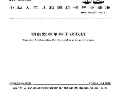 本标准规定了割前脱牧草种子收获机产品的技术要求、试验方法、检验规则及包装、运输、标志。本标准适用于采用梳刷脱粒方式对未割刈的禾本科和豆科牧草种子进行收获的收获机。 JB/T 10908-2008 割前脱牧草种子收获机 JB/T10908-2008 标准下载解压密码:www.bzxz.net