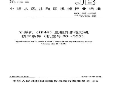 本标准代替JB/T10391—2002《Y系列三相片步电动机》和JB/T5274—1991《Y系列(IP44)三相异步电动机技术条件(机座号355)》。标准名称为《Y系列(IP44)三相异步电动机技术条件(机座号80~355)》。