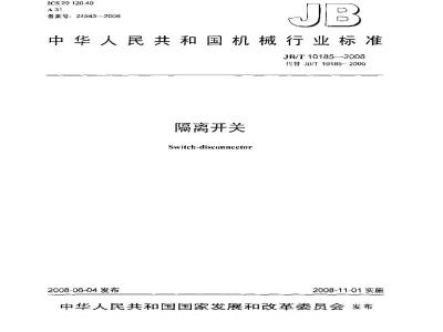 一增加了有关产品资料的内容,主要是有关标志和标识的统一规定。具体见标准第5章:一增加了额定电流100A的规格:产品由“开关熔断器组(负荷开关)”更改为“隔离开关\;第7章中删去有关烯断器特性等内容:-培加了隔离距离、额定冲击耐受电压等要求,并且消定期试验规则;—: --在第 7 章及第 8 章中增加了 GB 14048.3—2002的附录 A 中的有关要求。本标准由中国机械工业联合会提出。本标准由全国低压电器标准化技术委员会(SAC/TC189)归口。本标准负责起草单位:上海电器科学研究所(集团)有限公司。本标准参加起草单位:浙江正泰机电电气有限公司、德力两集团六公司、德力西集团十八公司、浙江天正电气股份有限公司、浙江奥丰电气有限公司。本标谁主要起草人:陈培国、周密。本标难参加起草人:王晓强、刘琰、尚松宝、熊华玉、马顺桃。本标准所代替标准的历次版本发布情况:JB/T 10185—2000