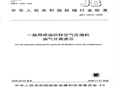 本标准规定了一般用喷油回转空气压缩机油气分离滤芯的要求、试验方法和检验规则、运输、标志、包装与贮存。本标准适用于额定工作压力0.35MPa~1.6MPa,滤芯流量1m3/min~100m3/min的滤芯。额定工作压力大于1.6MPa的滤芯可参照本标准执行。 JB/T 10910-2008 一般用喷油回转空气压缩机 油气分离滤芯 JB/T10910-2008 标准下载解压密码:www.bzxz.net