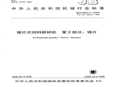 JB/T9822《锤片式饲料粉碎机》分为两个部分:第1部分:技术条件: