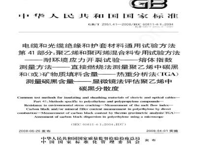 GB/T2951.41-2008/IEC60811-4-1:2004电缆和光缆绝缘和护套材料通用试验方法第41部分:聚乙烯和聚内烯混合料专用试验方法一耐环境应力开裂试验一熔体指数测量方法一直接燃烧法测量聚乙烯中碳黑和(或)矿物质填料含量一一热重分析法(TGA)测量碳黑含量一显微镜法评估聚乙烯中碳黑分散度