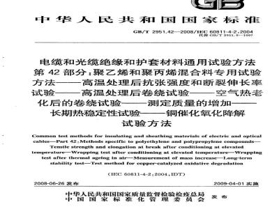 GB/T2951.42—2008/IEC60811-4-2:2004电缆和光缆绝缘和护套材料通用试验方法第42部分:聚乙烯和聚丙烯混合料专用试验方法一一高温处理后抗张强度和断裂伸长率试验一高温处理后卷绕试验一一空气热老化后的卷绕试验一一测定质量的增加长期热稳定性试验一铜催化氧化降解试验方法