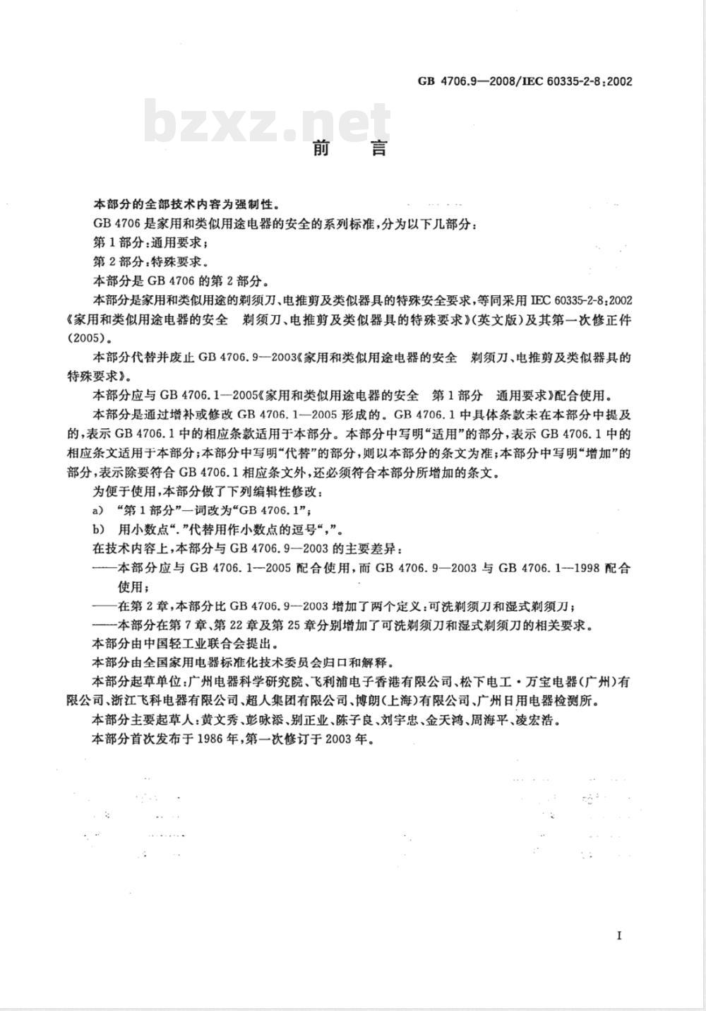 在第2章,本部分比GB4706.92003增加了两个定义:可洗剃须刀和湿式剃须刀;-本部分在第7章、第22章及第25章分别增加了可洗剃须刀和湿式剃须刀的相关要求。本部分由中国轻工业联合会提出。本部分由全国家用电器标准化技术委员会归口和解释。本部分起草单位:广州电器科学研究院、飞利浦电子香港有限公司、松下电工·万宝电器(广州)有限公司、浙江飞科电器有限公司、超人集团有限公司、博朗(上海)有限公司、广州日用电器检测所。本部分主要起草人:黄文秀、彭咏添、别正业、陈子良、刘宇忠、金天鸿、周海平、凌宏浩。本部分首次发布于1986年,第一次修订于2003年。GB4706.9—2008/IEC60335-2-8:2002IEC 前言