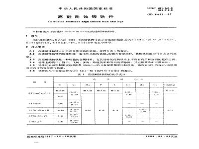 Corrosion resistant high silicon iron castings本标准适用于含硅10.00%~18.00%的高硅耐蚀铸铁件。牌号