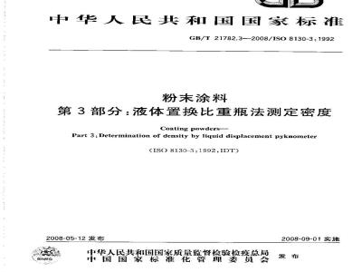 GB/T 21782.3—2008/IS0 8130-3:1992第3部分:液体置换比重瓶法测定密度GB/T21782的本部分规定了测定粉末涂料密度的液体置换比重瓶法,本方法是基于对试料的质量和体积的测定。