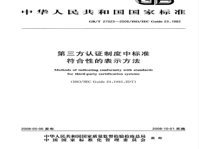 GB/T27023—2008/IS0/IECGuide23:1982第三方认证制度中标准符合性的表示方法本标准规定了与标准及标准中引用文件的符合性的表示方法。它主要针对标准的符合性,也同样适用于其他技术规范的符合性。它适用于认证机构授权下所做的符合性表示。2规范性引用文件