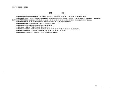 本标准等同采用国际标准ISO/IEC12207:1995《信息技术软件生存周期过程》。本标准是GB/T8566的第二次修订。本标准与GB/T8566-1995主要区别在于结构作了调整,把软件生存周期的所有过程归纳为基本过程、支持过程和组织过程,对部分术语名称作了修改。本标准的附录A是标准的附录,附录B至附录D是提示的附录。本标准自实施之日起代替GB/T8566—1995。本标准由中华人民共和国信息产业部提出。本标准由中国电子技术标准化研究所归口。本标准由中国电子技术标准化研究所和上海软件技术开发中心负责起草。本标准主要起草人:冯惠、周明德、杨启善、刘光龙、王宝艾。本标准首次发布于1988年,1995年第一次修订。85