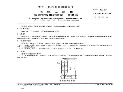 在室温下,蒸发液氨试样后,读取蒸发残留物体积,在指示剂存在下,以硫酸标准溶液滴定蒸发残留物中的氨,按规定公式计算,求得残留物含量。3试剂和溶液