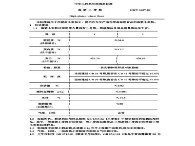 1.3粗细度中的筛上剩余物,在感量0.1g天平上称量不出数的,视为全部通过。1.4气味、口味:一批高筋小麦粉固有的综合气味和口味。1.5卫生指标按GB2715-81《粮食卫生标准》、GB2761-81《食品中黄曲霉毒素B1允许量标准》、GB2762-81《食品中汞允许量标准》、GB2763-81《粮食、蔬菜等食品中六六六、滴滴沸残留量》、GB4809-84《食品中氟允许量标准》执行。1.6动植物检疫项目按国家有关规定执行。2检验方法