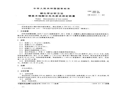 磺基水杨酸分光光度法测定铁量Nickel : Determination of iron content Sulfosalicylic acid spectrophotometric method本标准适用于镍中铁含量的测定。测定范围:0.0008%~0.70%。UDC 669. 24