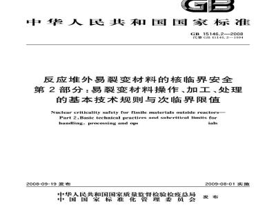 GB15146《反应堆外易裂变材料的核临界安全》迄今已经发布了下列11个部分:GB15146.1:第1部分:核临界安全行政管理规定(代替GB15146.1—1994)GB15146.2第2部分:易裂变材料操作、加工、处理的基本技术规则与次临界限值(代替GB15146.2—1994)