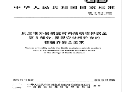 -GB/T15146.6反应堆外易裂变材料的核临界安全硼硅酸盐玻璃拉希环及其应用准则-GB15146.7反应堆外易裂变材料的核临界安全次临界中子增殖就地测量安全规定一GB15146.8反应堆外易裂变材料的核临界安全第8部分:堆外操作、贮存、运输轻水堆燃料单元的核临界安全准则(代替GB15146.8-1994)-GB15146.9反应堆外易裂变材料的核临界安全核临界事故探测与报替系统的性能及检验要求