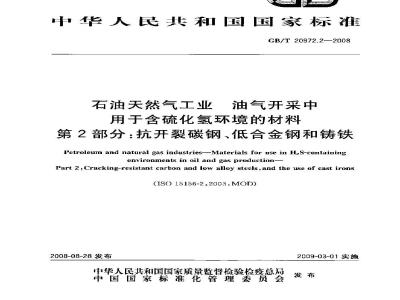 GB/T20972石润天然气工业油气开采中用于含硫化氧环境的材料>分为如下三个部分:-第1部分:选抗裂纹材料的一般原则:第2部分:抗开裂碳钢、低含金钢和铸铁:一第3部分:抗开裂耐独合金和其他合金。本部分为GB/120972的第2部分。GB/T20972是油气开采用于含硫化氛环境的材料的分部分出版的国家标准。下面列出本国家标准的结构及对应的ISO标准。