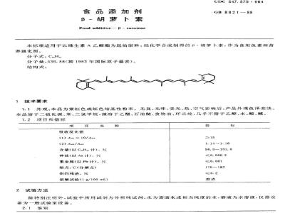 本标准适用于以维生素A乙酸酯为起始原料,经化学合成制得的β-胡萝卜素,作为食用色素和营养强化剂。 GB 8821-1988 食品添加剂β-胡萝卜 GB8821-1988 标准下载解压密码:www.bzxz.net
