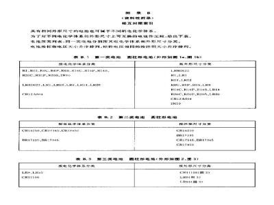 有相同外形尺寸的电池也可属于不同的电化学体系。为了对不同电化学体系的外形尺寸上可互换的电泄作比较,给出下表。电池按类列表,同一类电池分别按其电化学体系和外形尺寸分类。电池按标称电压大小升序排列,标称电压相同的按体积大小升序排列。表 B. 1第一类电池