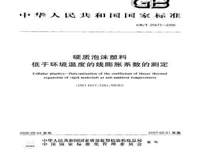 低于环境温度的线膨胀系数的测定本标推规定了测定硬质泡沫塑料低了坏境温度的线膨胀系数的方法。GI3/T20673—2006