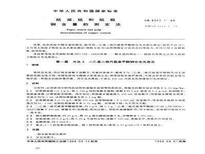 纸浆、纸和纸板中铜含量的测定,既可用二乙基二硫代氨基甲酸钠分光光度法测定(简称方法A),又可用火焰原子吸收分光光度法测定(简称方法B)这两种测定方法具有同等效力,并可应用于各种纸浆、纸和纸板,