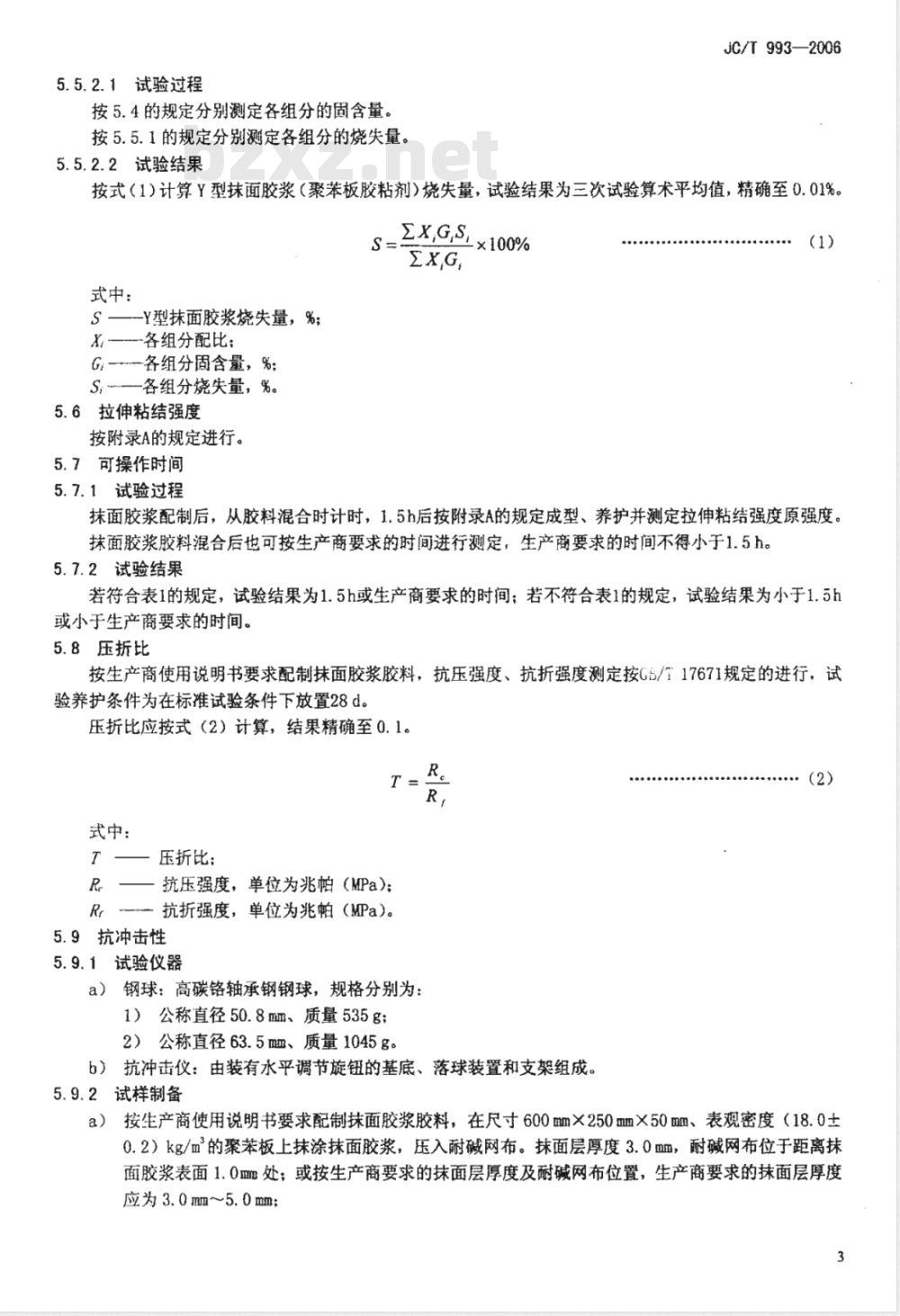 试验结果为试样灼烧前后质量差值占灼烧前质量的百分比,取三次试验算术平均值,精确至0.01%。5.5.2Y型抹面胶浆