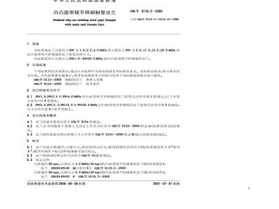 代替GB/T9116.11~9116.15—1988本标准规定了公称压力PN为1.6、2.5、4.0MPa和公称压力PN为5.0、11.0、15.0、26.0MPa的凹凸面带颈平焊钢制管法兰的型式和尺寸。本标准适用于公称压力PN1.6~PN26.0MPa的凹凸面带颈平焊钢制管法兰。2引用标准