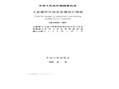 《工业循环却水处理设计规范》公告现批雅工业循环冷却水处理设计规范为国家标推,编号为GB50050-2007,自2008年5月1日起实施。其中,第3.1.6(2.4、5、6)、3. 1. 7、3. 2. 7、6. 1. 6. 8. 1. 7、8. 2. 1,8.2. 2,8. 5.1 (1、2、3、4、5、6.7)、8. 5. 4条(款)为制性条文.必须严格执行。原工业循环冷却水处理设计规范》GB50050-95同时废止: