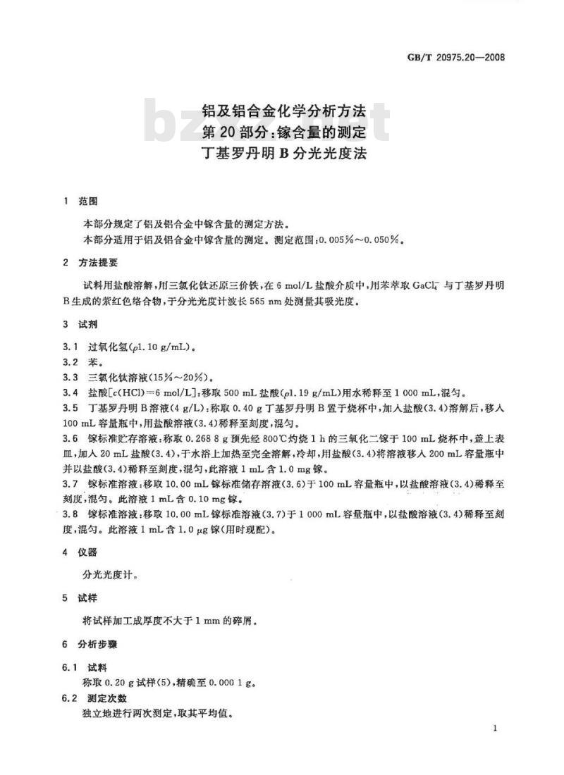 中文名称:铝及铝合金化学分析方法 第20部分:镓含量的测定 丁基罗丹明B分光光度法