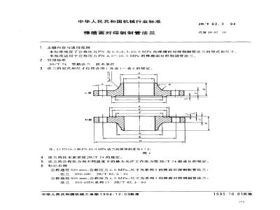 本标准代替JB 79-82。 本标准规定了公称压力PN为4.0,6.3,10.0MPa的榫槽面对焊钢制管法兰的型式和尺寸。 本标准适用于公称压力PN4.0~10.0MPa的榫槽面对焊钢制管法兰。 JB/T 82.3-1994 榫槽面对焊钢制管法兰 JB/T82.3-1994 标准下载解压密码:www.bzxz.net