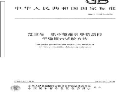 本标准为首次制定。本标准规定了极不敏感引爆物质的子弹撞击试验的方法原理、试验设备、试样准备、试验步骤和结果表示。本标准适用于极不敏感引爆物质的测试。 本标准对应于联合国《关于危险货物运输的建议书:试验和标准手册》(第四修订版),与其一致性程度为非等效,其有关技术内容与上述手册完全一致,在标准文本格式上按GB/T1.1—2000做了编辑性修改。 GB/T 21625-2008 危险品 极不敏感引爆物质的子弹撞击试验方法 GB/T21625-2008 标准下载解压密码:www.bzxz.net