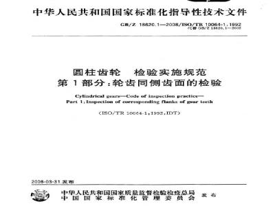 第1种类型和第2种类型的技术报告,在发布后的三年内进行复审,以确定他们能否转成国际标准。第3种类型的技术报告,不一定要复审,一直用到所提供的资料,不再认为有用或有效时为止。ISO/TR10064-1是属于第3种类型的技术报告,它是由ISO/TC60齿轮技术委员会制定的。这份报告提供了齿轮检验实施的说明和建议。ISO/TR10064在总标题圆柱齿轮检验实施规范”下,包括下列部分—第1部分:轮齿同侧齿面的检验,一第2部分:径向综合偏差、径向跳动、齿厚和侧隙的检验。GA/Z18620.1—2008/IS0/IR10064-111992IS引言