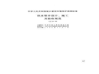 根据原国家城市建设总局(80)城科字第51号文安排,由中国市政丁程西南设计院负责组织编制的《供水管井设计、施工及验收规范》,现经我部审查,批准为部标准,编号为CJJ10一86,918