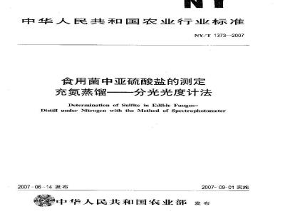 NY/T 1373-2007 食用菌中亚硫酸盐的测定充氮蒸馏-分光光度计法 NY/T1373-2007 标准下载解压密码:www.bzxz.net