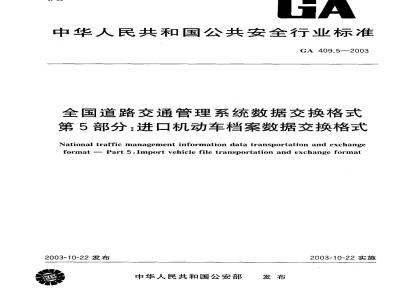 GA409《全国道路交通管理系统数据交换格式》分为5部分:第1部分:机动车驾驶员数据交换格式;第2部分:机动车登记数据交换格式;第3部分:交通违章数据交换格式;第4部分:交通事故统计数据交换格式;第5部分:进口机动车档案数据交换格式。本部分为GA409的第5部分。