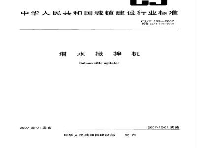 本标准是在CJ/T109一2000《潜水搅拌机》基础上修订完成的。本标准与CJ/T109--2000相比主要变化如下:增加了潜水搅拌机的专用定义和术语。CJ/T109—2007