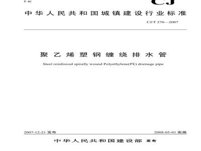 本标准为首次发布。本标准规定了用钢带与聚乙烯(中密度或高密度)通过挤出方式成型的塑钢复合带材,经缠绕焊接制成的塑钢缠绕管的定义、符号和缩略语,材料,产品结构,分类和连接方式,要求,试验方法,检验规则,标志、运输、贮存。该管材适用于长期输送介质温度在45℃以下的无压埋地城镇排水、工业排水以及农田排水等工程。 CJ/T 270-2007 聚乙烯塑钢缠绕排水管 CJ/T270-2007 标准下载解压密码:www.bzxz.net