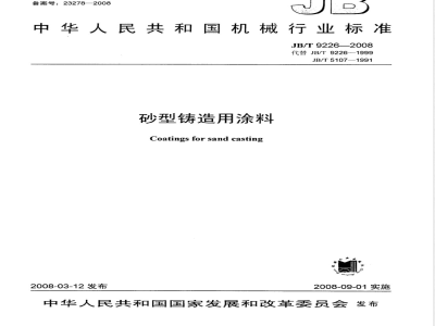 本标准规定了砂型(芯)铸造用涂料的术语和定义、分类和牌号、技术要求、试验方法、检验规则以及标签、包装、运输和贮存。本标准适用于砂型(芯)铸造用载体为水或有机溶剂的浆状、膏状和粉(粒)涂料。 JB/T 9226-2008 砂型铸造用涂料 JB/T9226-2008 标准下载解压密码:www.bzxz.net