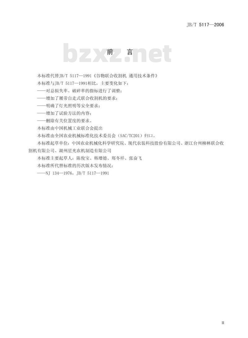 本标准起草单位:中国农业机械化科学研究院、现代农装科技股份有限公司、浙江台州柳林联合收割机有限公司、湖州星光农机制造有限公司本标准主要起草人:陈俊宝、韩增德、郑冬祥、张奋飞本标准所代替标准的历次版本发布情况:NJ134—1976,JB/T5117-—1991Ⅱ