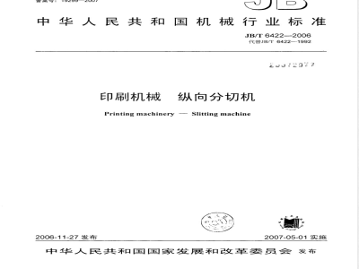 修改完善了标志、包装、运输和贮存内容(见第7章)。本标准的附录A为资料性附录,附录B、附录C、附录D为规范性附录。本标准由中国机械工业联合会提出。本标准由全国印刷机械标准化技术委员会(SAC/TC192)归口。本标准主要起草单位:中山松德包装机械有限公司、陕西北人印刷机械有限责任公司。本标准参加起草单位:浙江省机械产品质量检验中心。本标准起草人:左光申、李百刚、平瑶、赵德滨、倪剑生。本标准代替标准的历次版本发布情况:JB/T6422—1992。