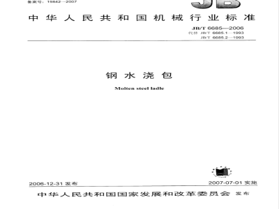 一增加了浇包桶体厚度的要求;修改了部分条款的规范性引用文件:一将浇包装载量试验由2倍额定容量改为1.2倍额定容量,试验时间由2h改为4h;一删除了部分常规的试验方法,增加了轴向间隙差值的测定方法。本标准由中国机械工业联合会提出。本标准由全国铸造机械标准化技术委员会(SAC/TC186)归口。本标准负责起草单位:青岛青力环保设备有限公司、威海市铸造机械厂。本标准参加起草单位:苏州花锦铸造设备厂、青岛中智达环保熔炼设备有限公司。本标准主要起草人:于仁先、迟英杰、冯勤伟、段金挺。本标准所代替标准的历次版本发布情况:-JB/T6685.1—1993;