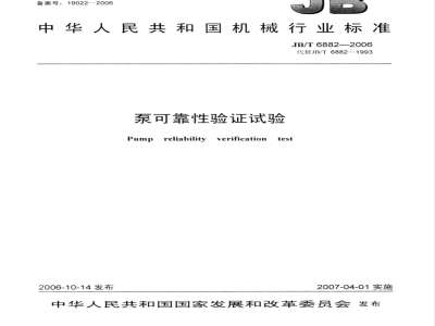 本标准规定了泵可靠性验证试验的指标选择、抽样规定、故障判据、试验程序和试验报告数据等。本标准适用于核查泵的可靠性指标量值是否达到可靠性规定指标的试验,且试验室和现场两种可靠性试验方式均适用。 JB/T 6882-2006 泵可靠性验证试验 JB/T6882-2006 标准下载解压密码:www.bzxz.net