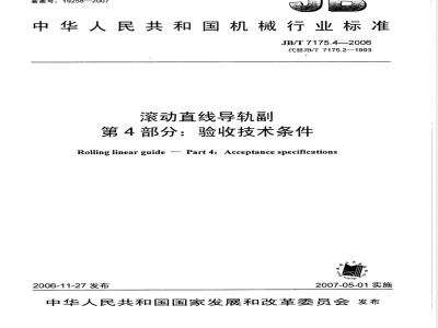 滚动直线导轨副第4部分:验收技术条件JB/T7175的本部分规定了两滚道型、四滚道型滚动直线导轨副的精度等要求及检验方法。本部分适用于以滚珠为滚动体的滚动直线导轨副。其他滚动体的直线导轨副亦可参照使用。2规范性引用文件