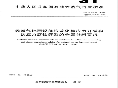 本标准规定了含硫化氢油气田地面设施用金属材料抗硫化物应力开裂和(或)抗应力腐蚀开裂的金属材料及制造工艺的要求。 本标准适用于与含硫化氢介质接触的地面设施,如石油货天然气井场、集气站、处理厂的工艺设备和采、集气管线等。 SY/T 0599-2006 天然气地面设施抗硫化物应力开裂和抗应力腐蚀开裂的金属材料要求 SY/T0599-2006 标准下载解压密码:www.bzxz.net