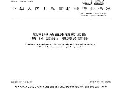 本部分是JB/T7658的第14部分。本部分代替JB/765814--1995氨制冷装置用氮液分离器》求部分与JB/T7658.14--1995相比,主要变化如下:翻险原标准中“成套性”、“谢件”“保用期”的内容型式、型号及基本参数作为资料性附票。本部分的附录A是资料性附录。