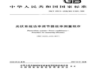 GB/T 20514—2006/1EC 61683:1999光伏系统功率调节器效率测量程序本标准规定了在独立和并网光伏系统中功率调节器效率的测最方法,其中功率调节器的输出是一定赖率的稳定交流电压或者是稳定的直流电压。这个效率是在制造厂通过直接测重输人输出功率的大小而计算出来的。本标准也适用于包括隔离变压器的情况。2规范性引用安件