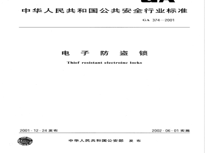 本标准规定了电子防盗锁的技术要求和测试方法。GA374-2001