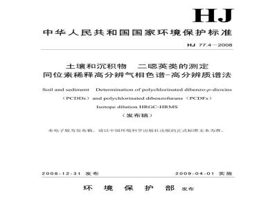 本标准是对《多氯代二苯并二嗯英和多氯代二苯并呋喃的测定同位素稀释高分辨毛细管气相色谱/高分辨质谱法》(HJ/T77-2001)的修订。自本标准实施之日起,替代HJ/T77-2001中土壤及沉积物样品测定部分。本标准的附录A为规范性附录,附录B、附录C、附录D、附录E为资料性附录。本标准由环境保护部科技标准司组织制订。本标准起草单位:国家环境分析测试中心。本标准环境保护部2008年12月31日批准本标准自2009年4月1日起实施,本标准由环境保护部解释。