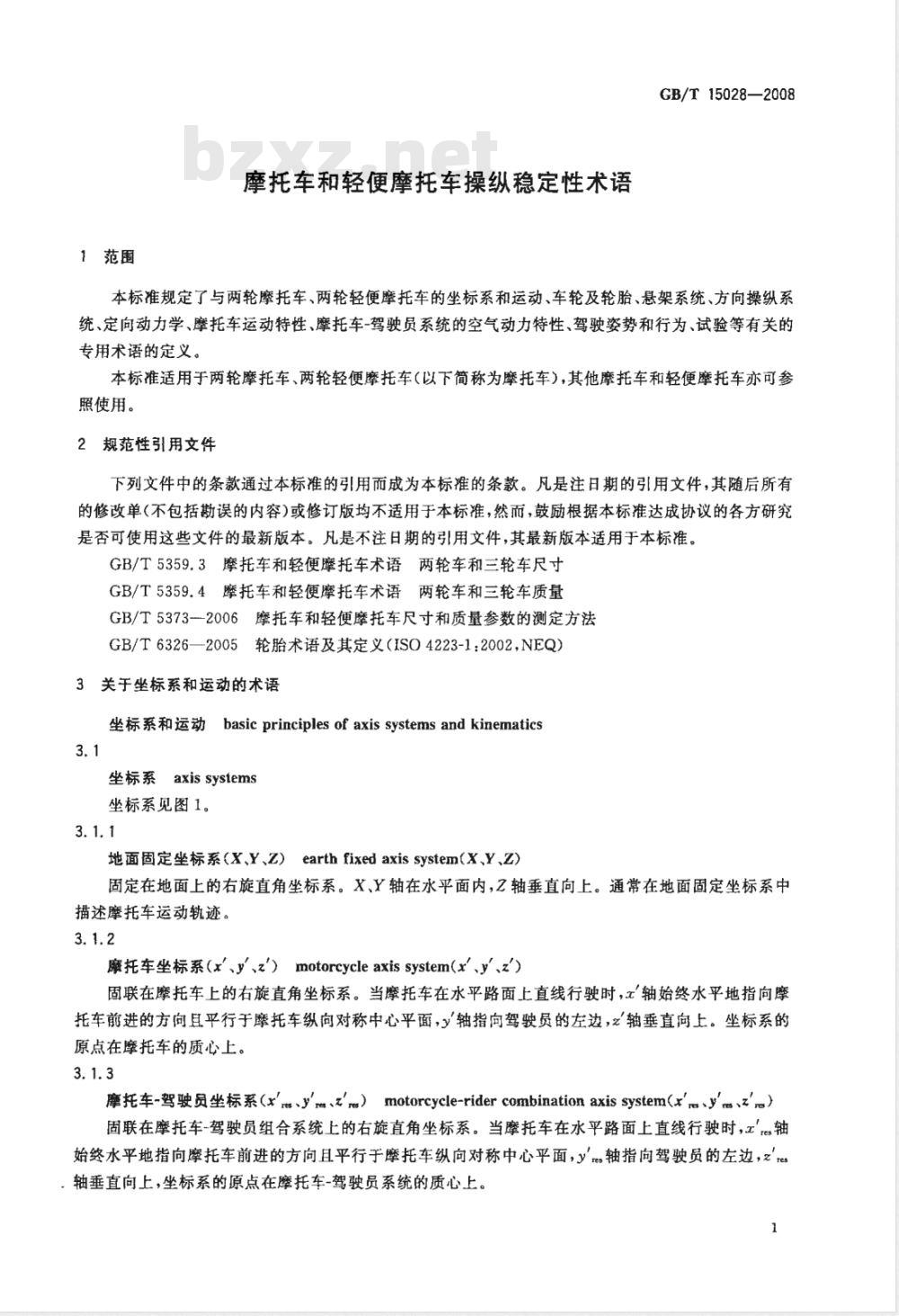 下列文件中的条款通过本标准的引用而成为本标准的条款。凡是注日期的引用文件,其随后所有的修改单(不包括勘误的内容)或修订版均不适用于本标准,然而,鼓励根据本标准达成协议的各方研究是否可使用这些文件的最新版本。凡是不注日期的引用文件,其最新版本适用于本标准。GB/T5359.3摩托车和轻便摩托车术语两轮车和三轮车尺寸GB/T5359.4摩托车和轻便摩托车术语两轮车和三轮车质量GB/T5373—2006摩托车和轻便摩托车尺寸和质量参数的测定方法GB/T6326—2005轮胎术语及其定义(ISO4223-1:2002,NEQ)3关于坐标系和运动的术语